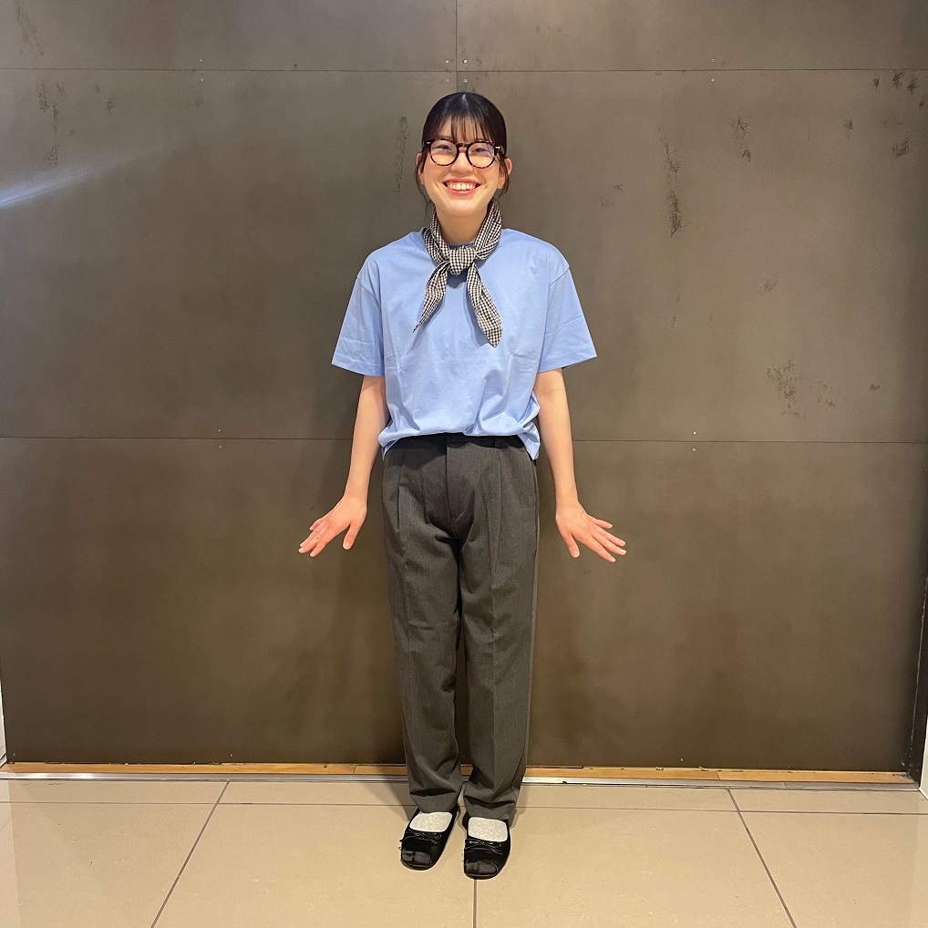 夏らしいライトブルーTシャツを使用したコーディネートです。