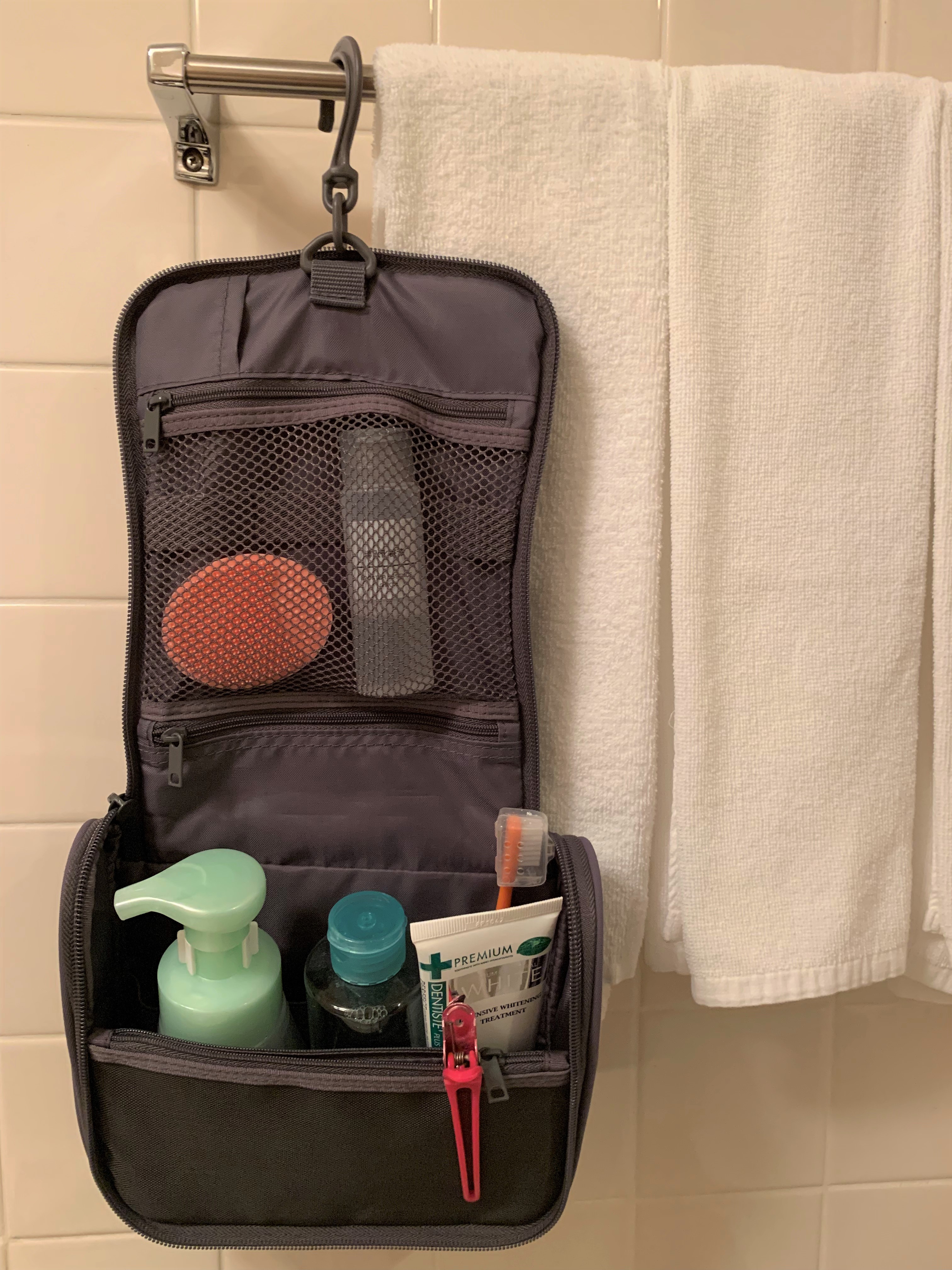 収納力もたっぷりで、ポケットは4つコットンや歯ブラシ、コンタクトケースなどの洗面用品がまとめて収納できます。ブラシを留めておくゴムもついているのでぐちゃぐちゃになりません。