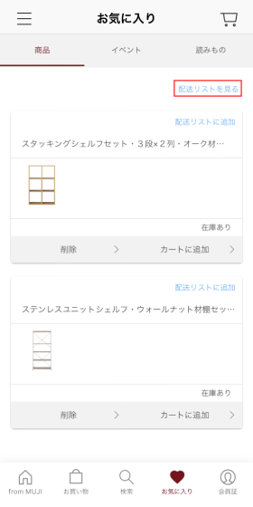無印良品では、MUJIパスポートでお気に入り登録をした商品をまとめて配送リストをつくることができます。
