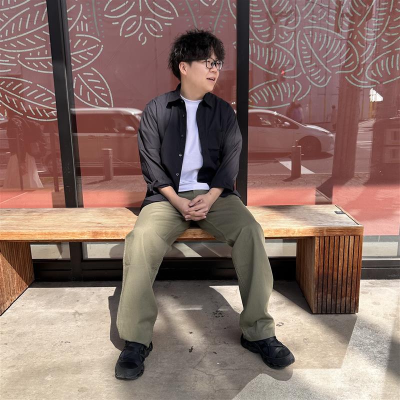 ボトムスはカーキグリーンのチノワイドパンツを合わせることでアクセントにもなり、おしゃれに仕上がっています。
