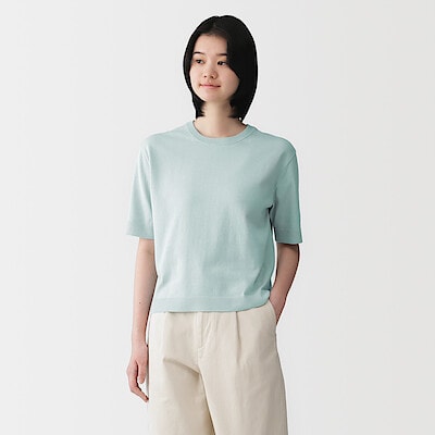 婦人 UVカット強撚コットン五分袖セーター 婦人L・ライトグリーン