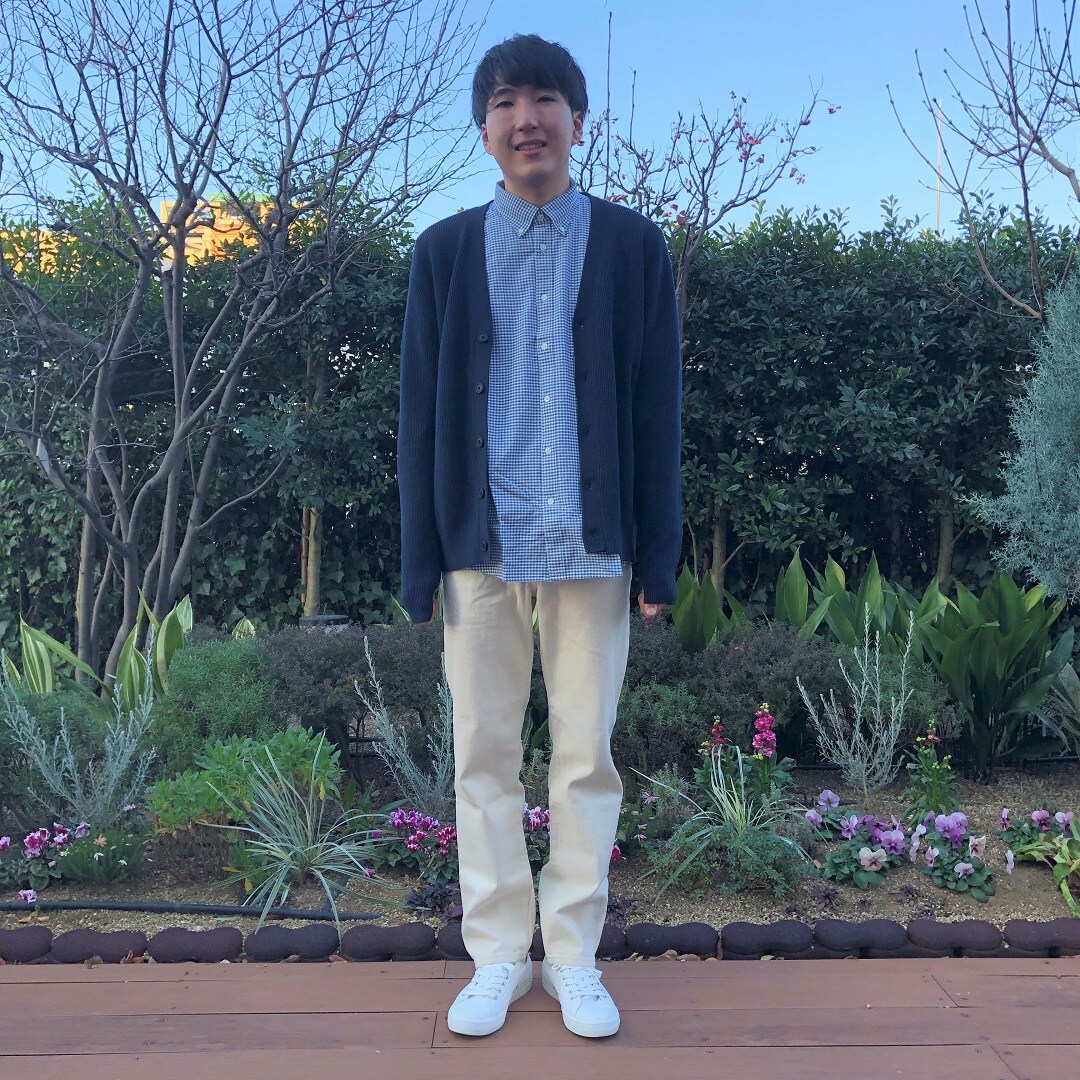 男性スタッフ着用:型崩れしにくい糸で編んだVネックカーディガン(ダークネイビー)、洗いざらしオックスボタンダウン長袖シャツ(ライトグリーンチェック)、デニムレギュラーパンツ(生成)