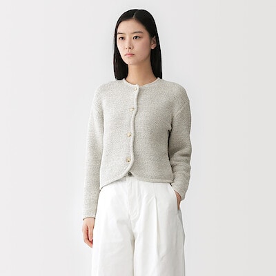 丸みのあるシルエットになっているので、コンパクトなニットジャケットととても相性よく着ていただけます。