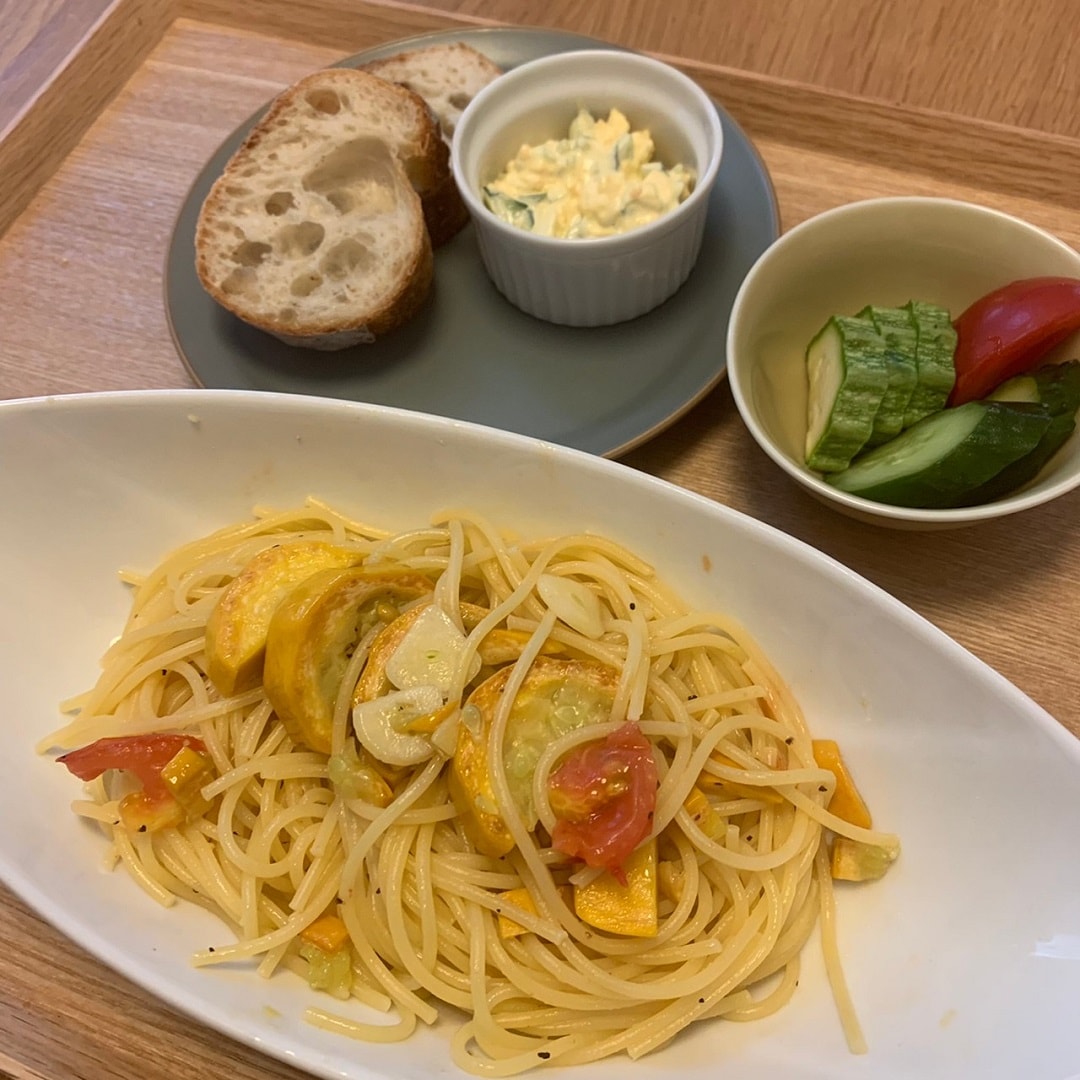 オリーブオイル、にんにく、ブラックペッパーを入れて“ズッキーニとトマトのオイルパスタ”も出来ました。