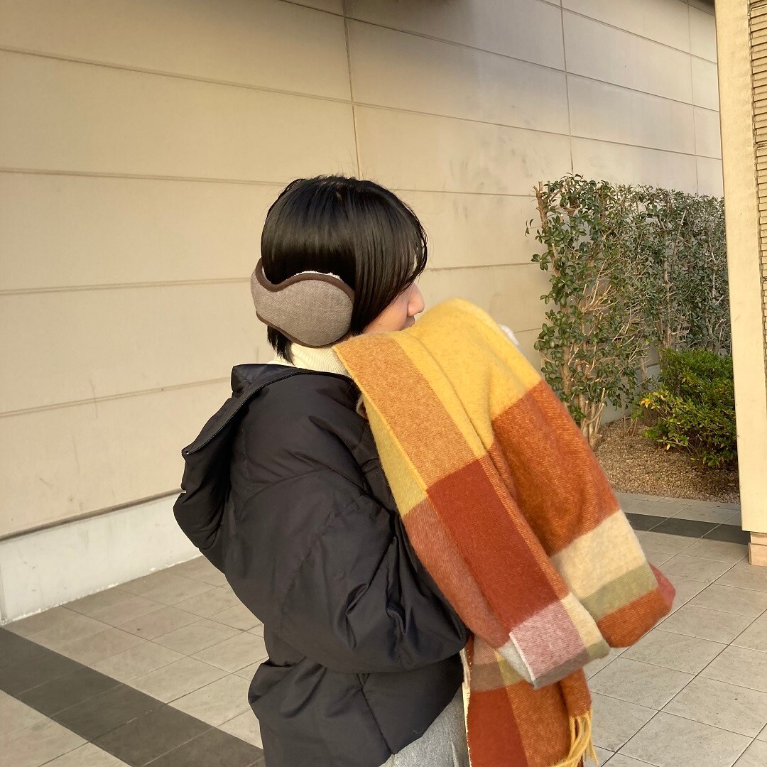 チェックのストールを差し色に使って温かみをプラスしてみました。