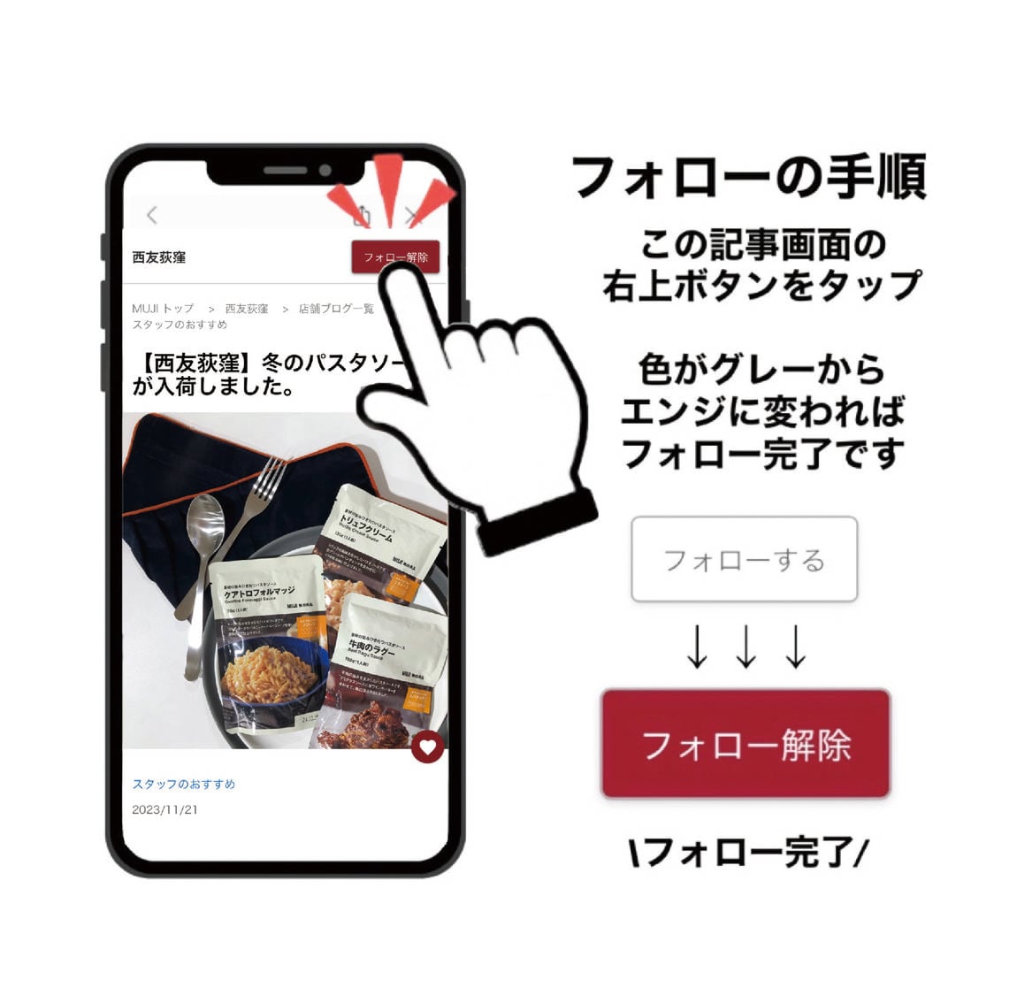 こちらのおたよりの右上にあるフォローボタンをタップ。白からエンジ色に変わればフォロー完了です。