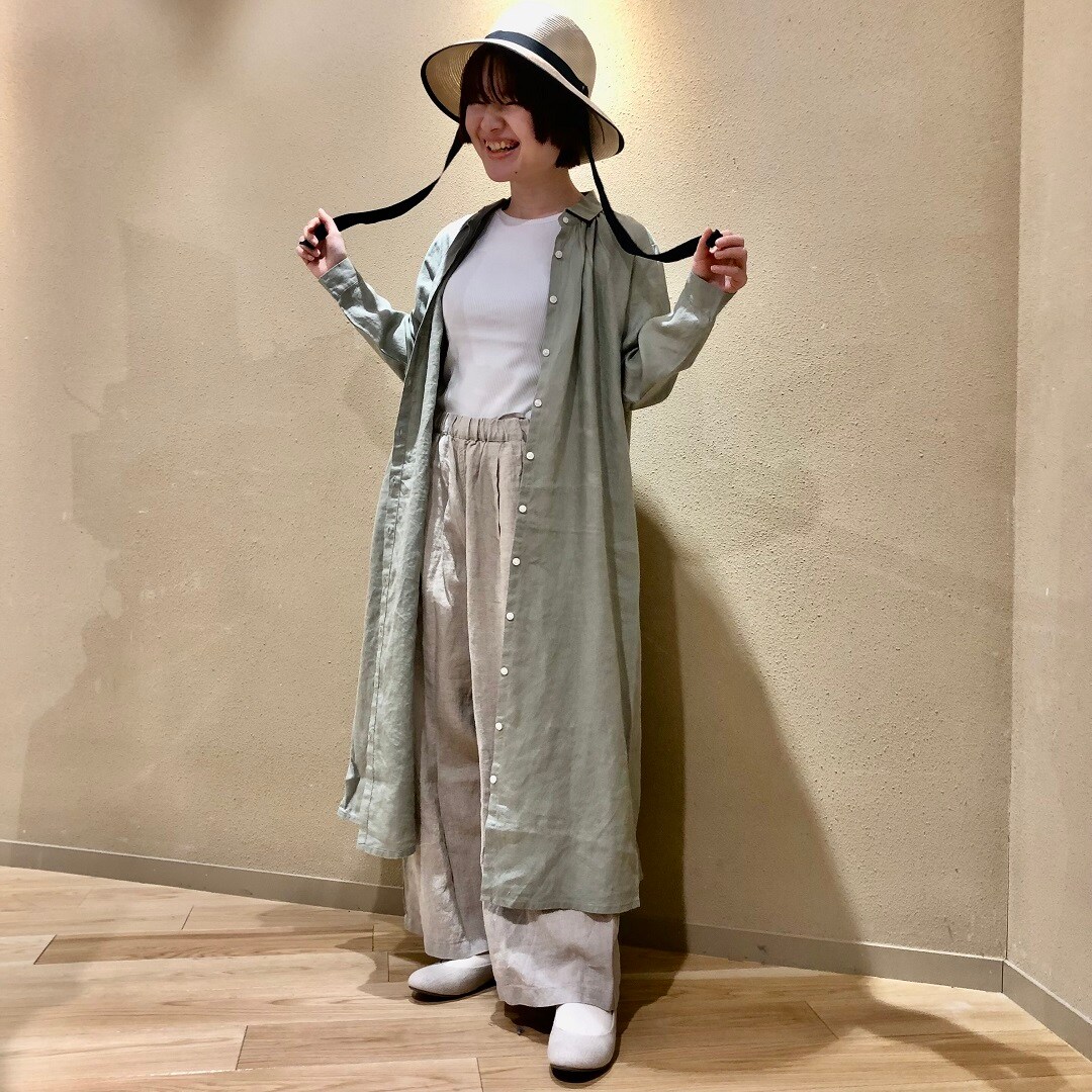 今回は中にTシャツ、同じ素材のリネンのパンツ、そして同じく新商品のキャペリンも合わせて、春のお出掛けにオススメのコーディネートにしました。