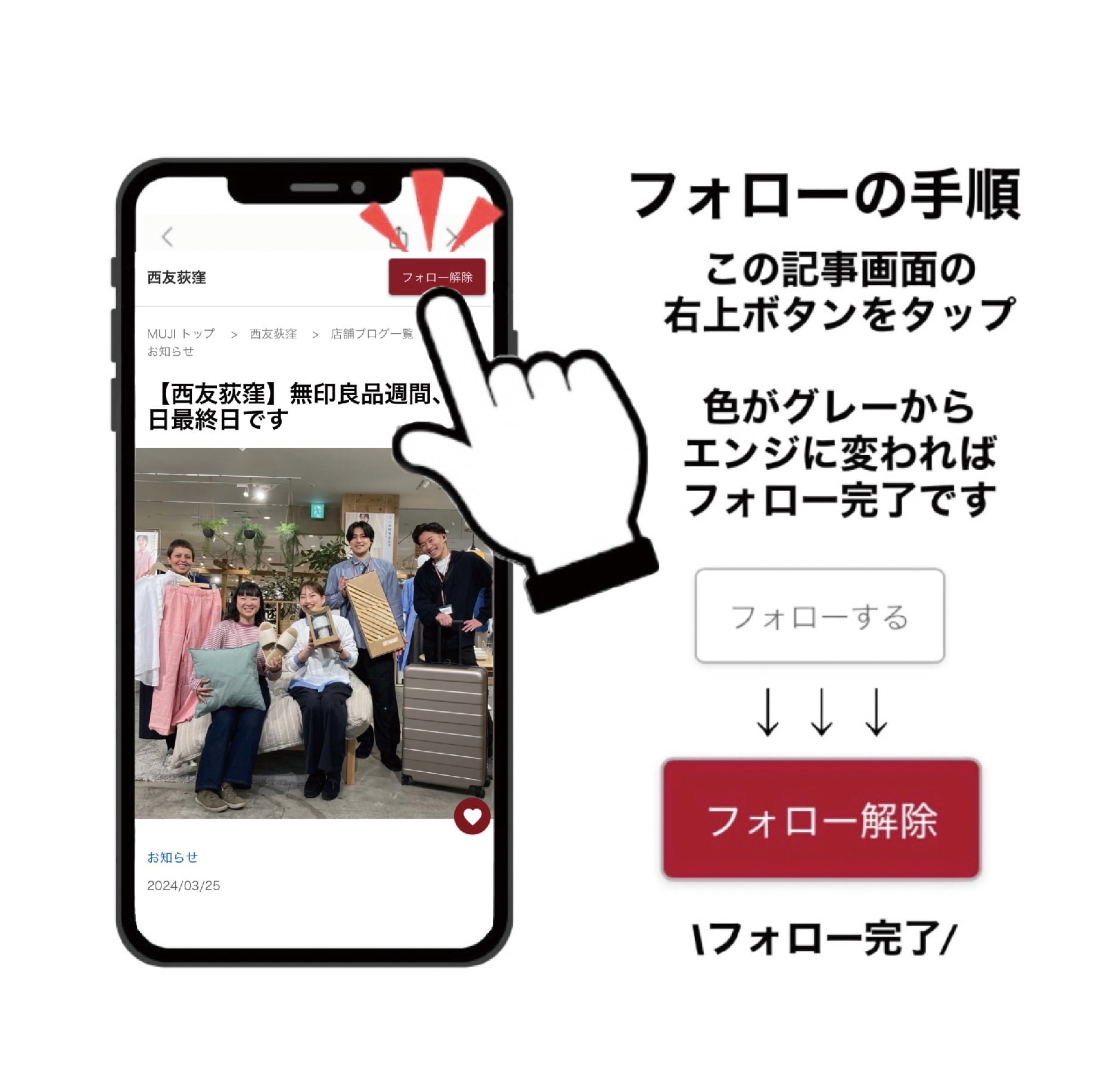 「無印良品 西友荻窪」をフォローいただきますと、MUJI passport内のfrom MUJI より、西友荻窪からのお知らせをご覧いただけます。