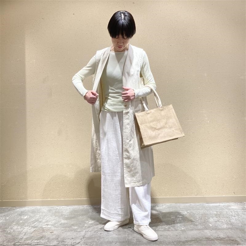 新商品のヘンプ混 ツイル ロングジレと、透け感が素敵なシアーアイテムを組み合わせたコーディネート。