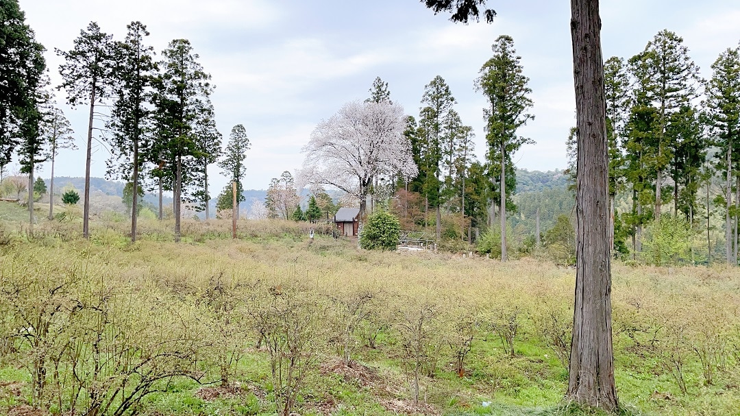 大きな桜と共に、園内にブルーベリー畑が広がっており、とても圧巻です。
