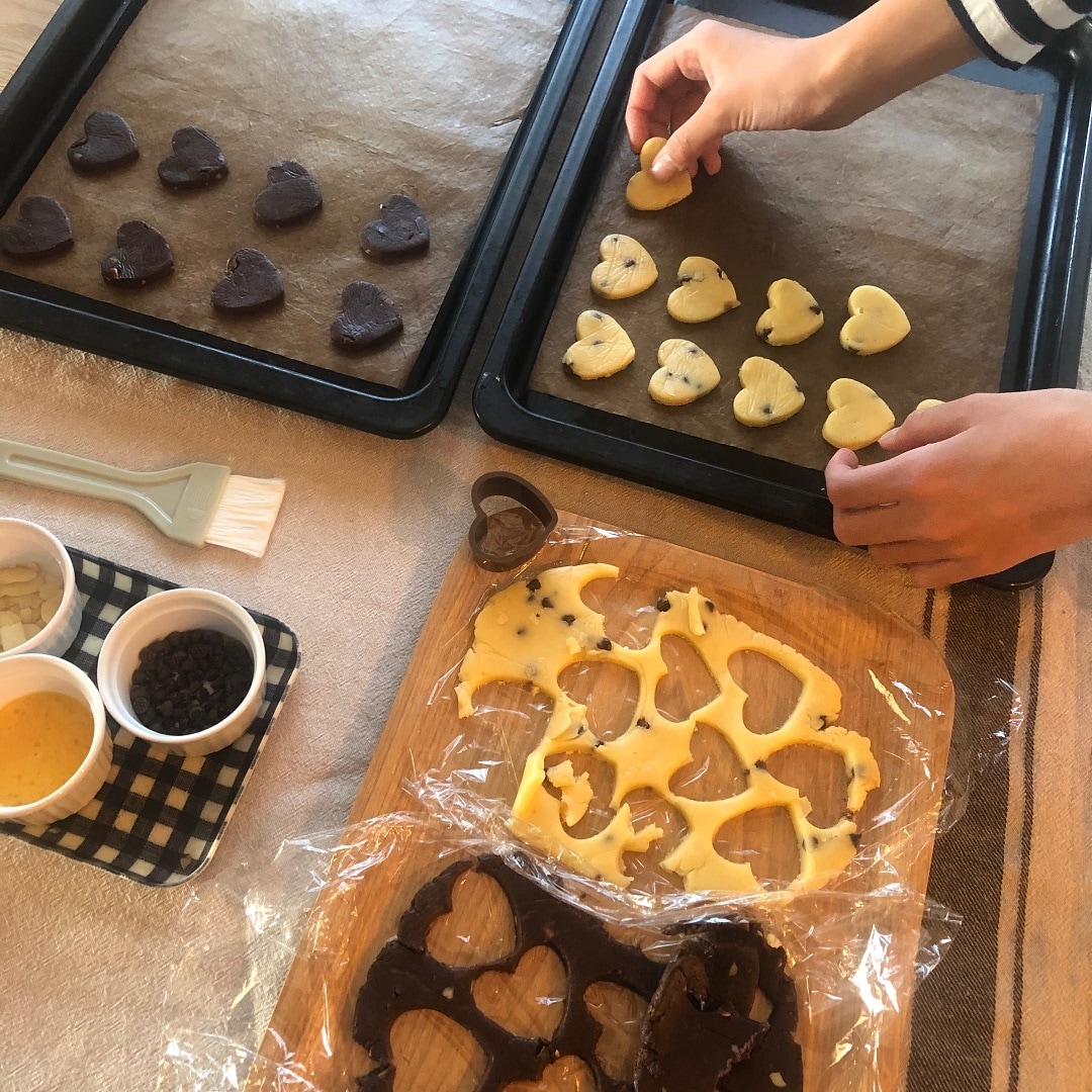 生地を冷蔵庫で休ませてから、薄く伸ばしハートの型で抜き、卵を塗ります。