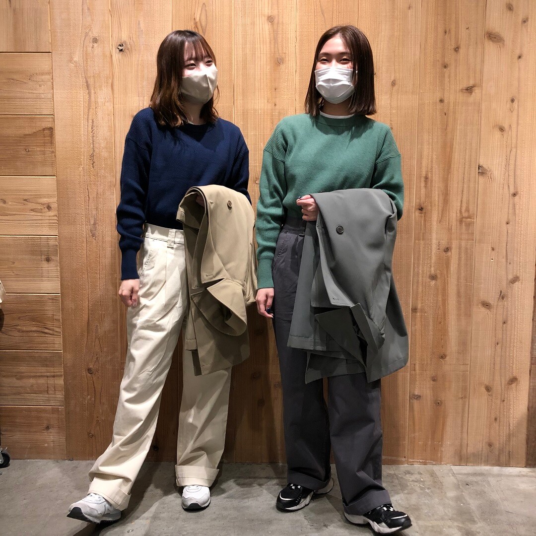 左のスタッフは、ベージュをベースにトーンの変えたパンツを入れ春らしさを出し、差し色でネイビーを入れメリハリを出すようにしました。