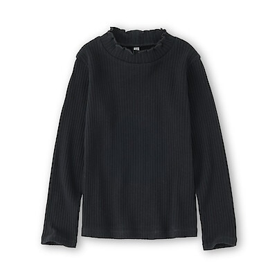 ストレッチジャカード編みハイネック長袖Tシャツは肌あたりが優しい糸を使用していています。ネック部分にはメロウフリルをあしらったかわいいデザインのTシャツです。