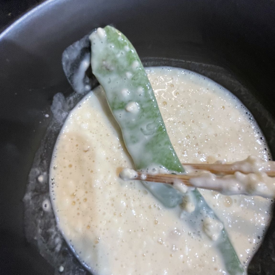 3.薄力粉のダマが少し残るくらいになったら、衣にくぐらせて熱した油で揚げます。