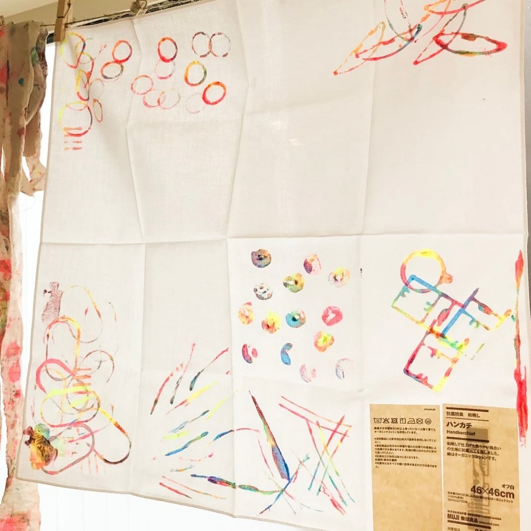 シンプルな服やマイバッグなどの綿素材に廃材を使用したスタンプ遊びが楽しめます。