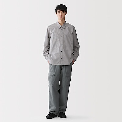 MUJI Laboのローゲージセーターを主役に、シャツとのレイヤードできちんと感をプラスしたコーディネートです。