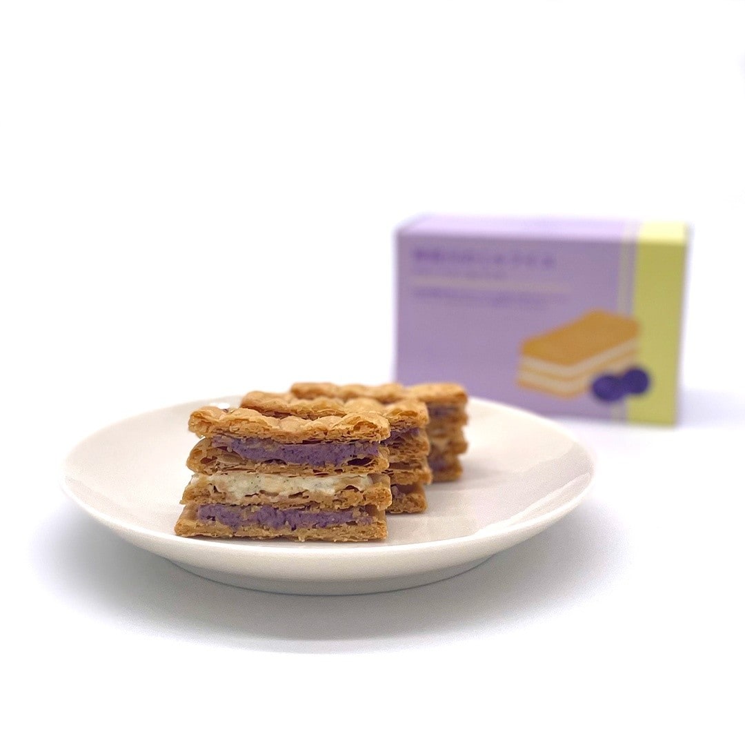 小田原で育った甘酸っぱいブルーベリーをまるごと使ったクリームとバニラクリームをさくさくのミルフイユ生地で挟みました。