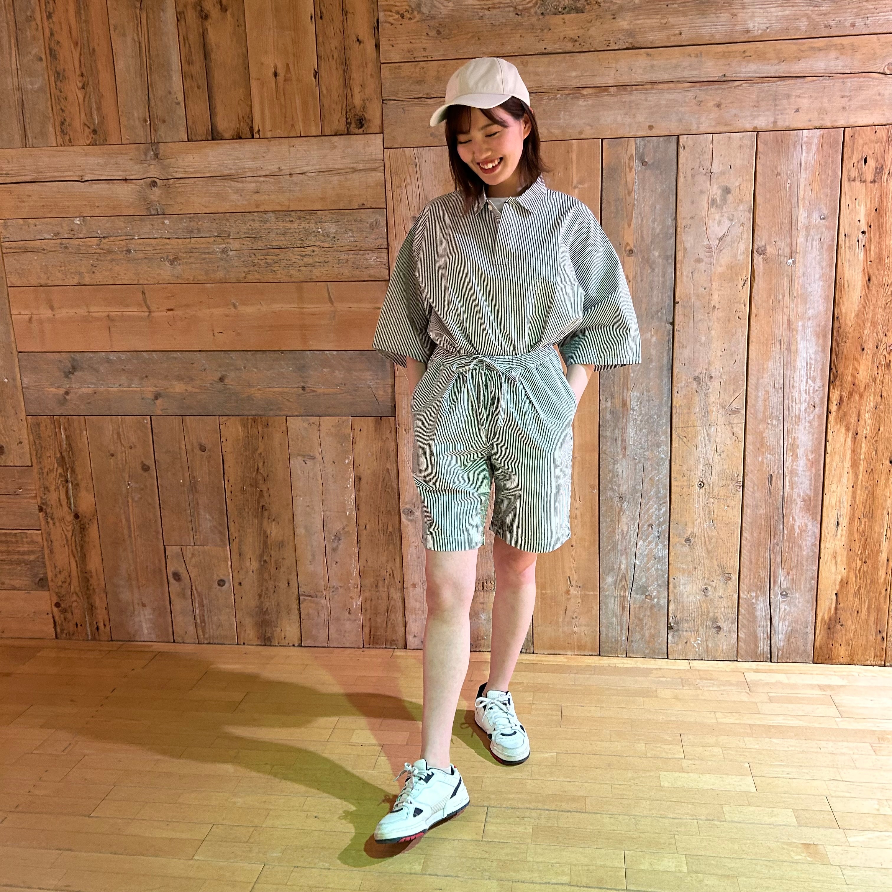 凹凸のあるサッカー地で仕立てたセットアップに、UVカットと撥水加工を兼ね備えたキャップを合わせたスポーティーなコーディネートです。