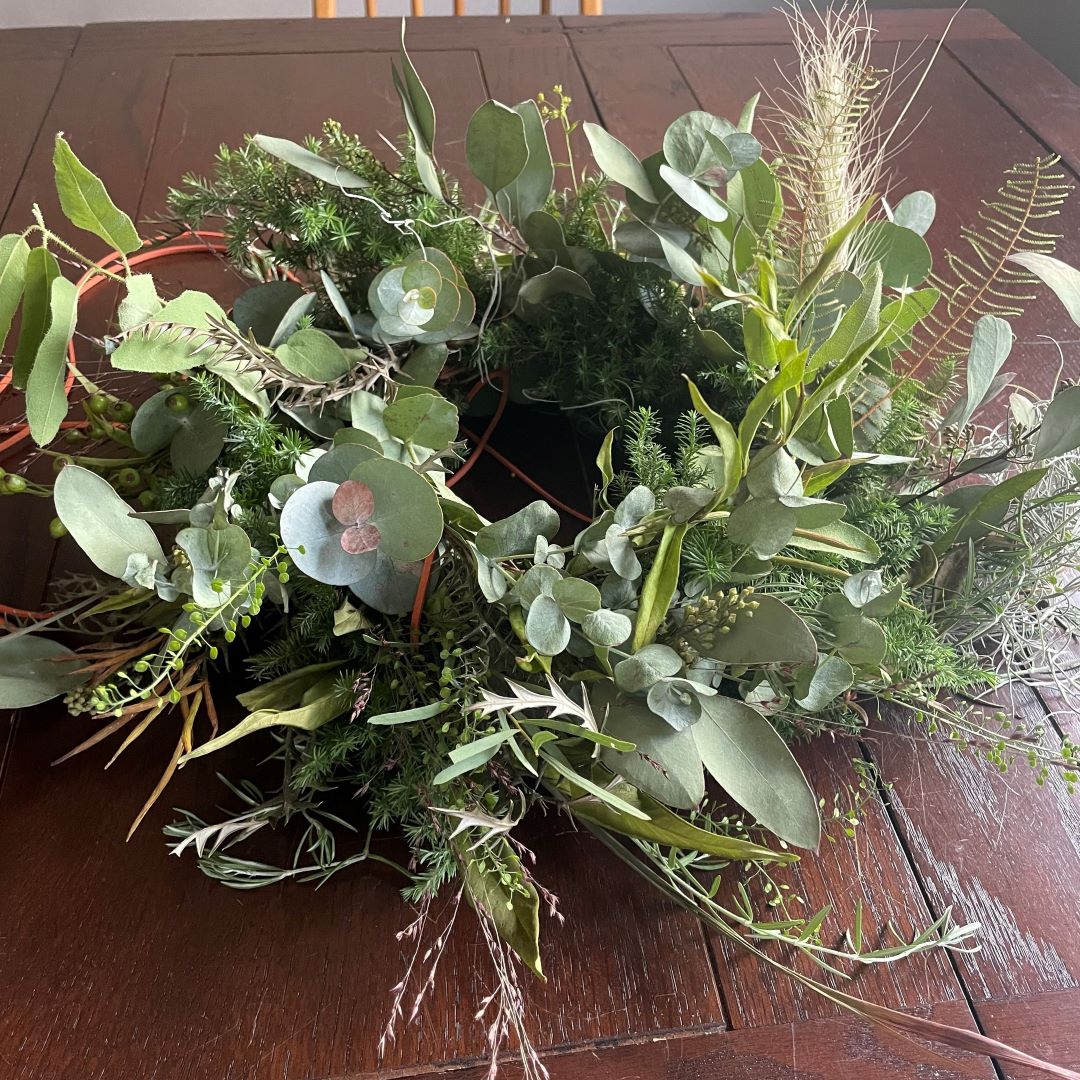グリーンを中心に、所々に季節のお花を添えながら、爽やかなリースを作ってみませんか?