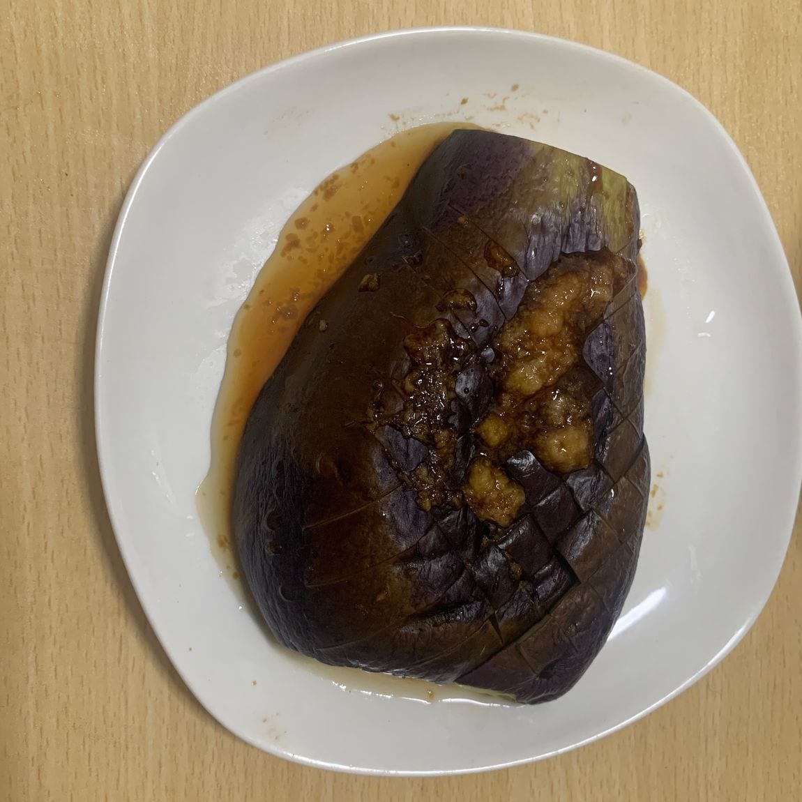 なすのヘタを落としてラップで包み、電子レンジにかけます。