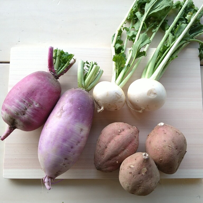 今回は先週の販売で好評だった「紅くるり大根」「紫大根」「白かぶ」「安納芋」が並んでいます。