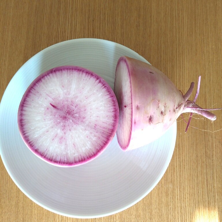 こちらは紫大根です。カットしてみるときれいな模様と紫色が目を引きます。