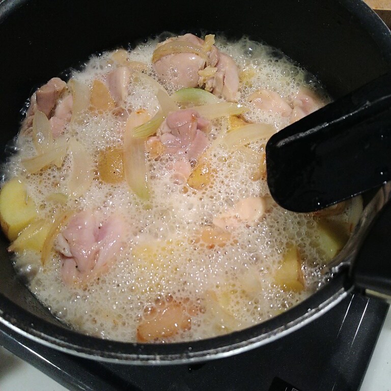 りんご・じゃがいも・玉ねぎ・鶏もも肉をひと口大にカットします。