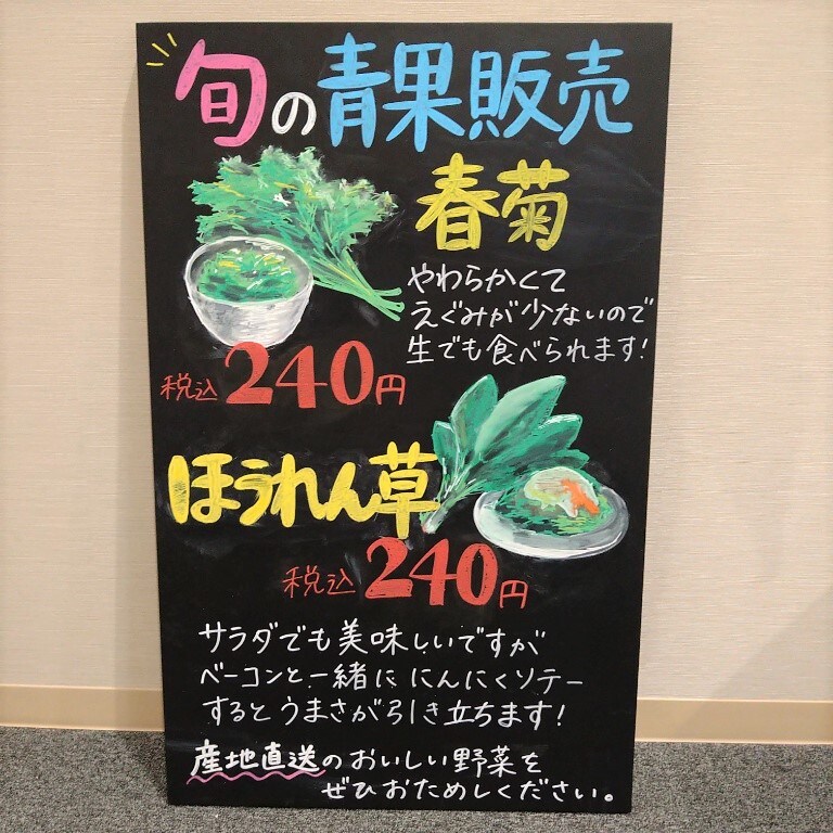 春菊は長野県、ほうれん草は神奈川県で採れたもので、どちらも今朝お店に届いた新鮮な野菜です。