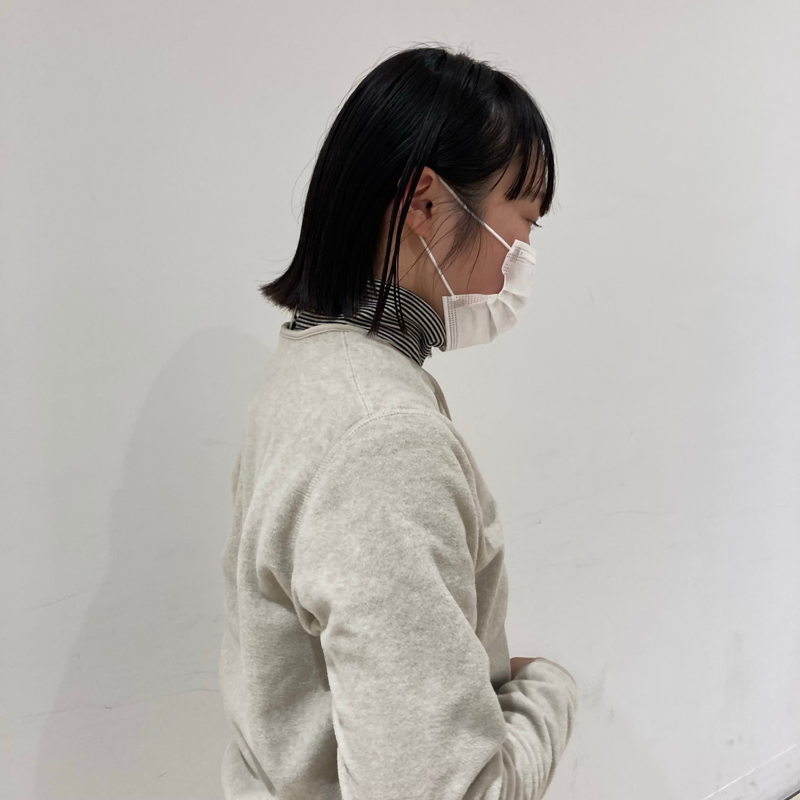 フリースカーディガンを使い、全身を白で統一した暖かいコーディネートにしました。