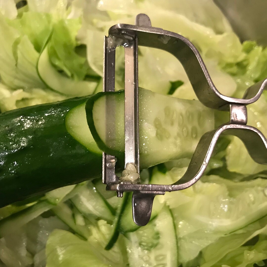 じゃがいも、人参などの皮むきはもちろん、どっしりしたかぼちゃの皮だって安定してひけますし、きんぴら用のささがきにも、この夏はサラダ用のキューリのスライスにも活躍してくれました。また、刃の両側に耳か角のように出っ張った部分は、じゃがいもの芽などをくりぬくのにとっても便利なんです(両側についているので、左利きの方にも使いやすいと思います)。