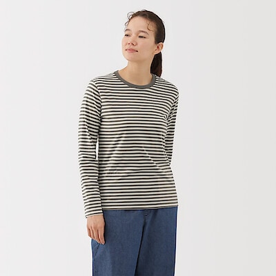 婦人 天竺編みクルーネック長袖Tシャツ 婦人XL・ミディアムグレーボーダー