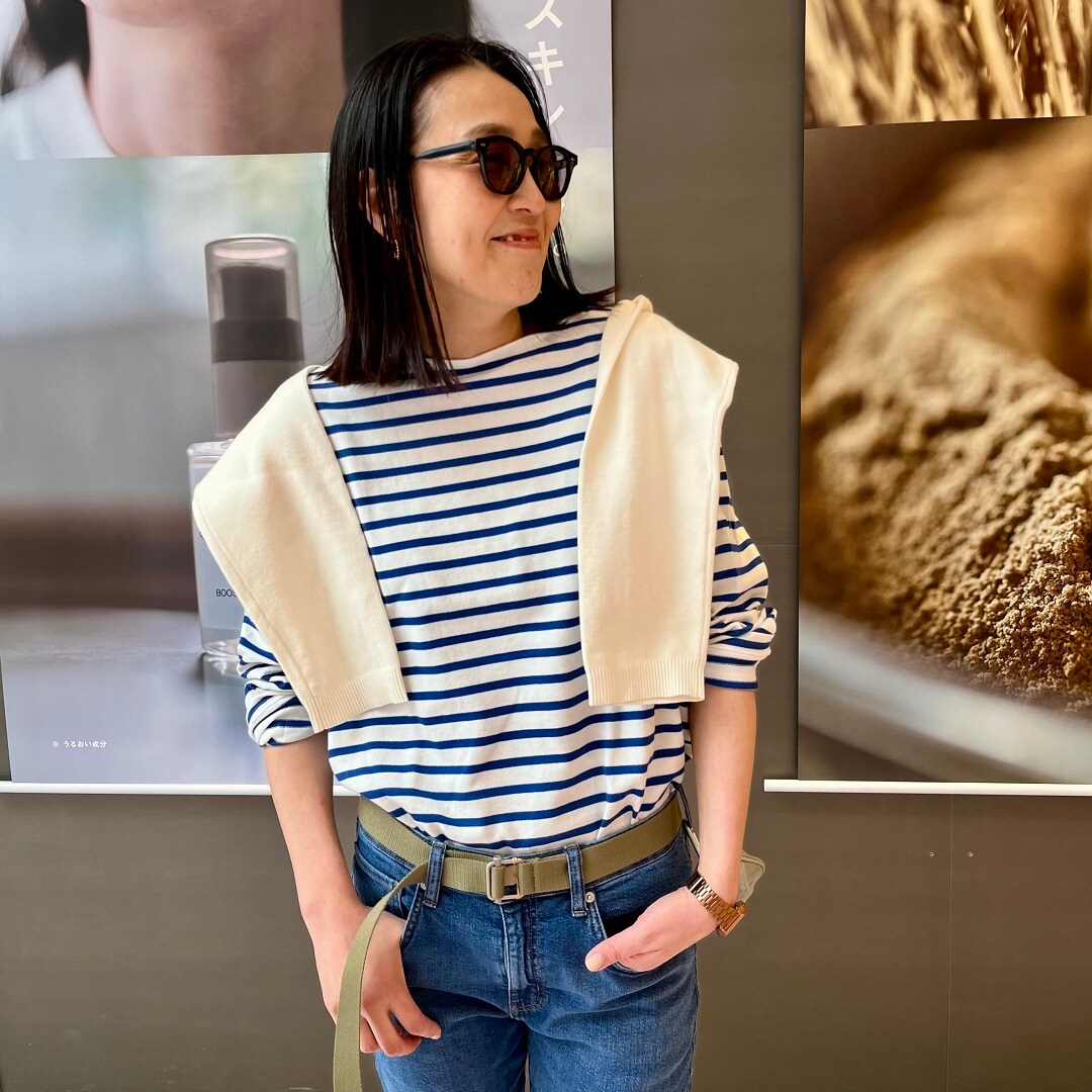 婦人 太番手ボートネック長袖Tシャツ 婦人XL・ブルーボーダー