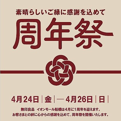 【無印良品500 ペリエ千葉エキナカ】無印良品イオンモール船橋「周年祭」開催のお知らせ