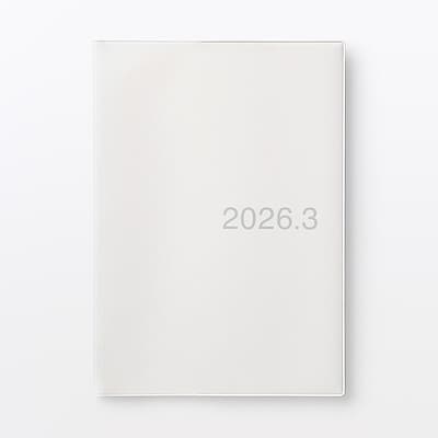 日曜日始まりの見開き1ヶ月と横罫フリーページの、透明カバー付き上質紙スケジュールノートです。日曜日と祝日の日付は赤字にしています。