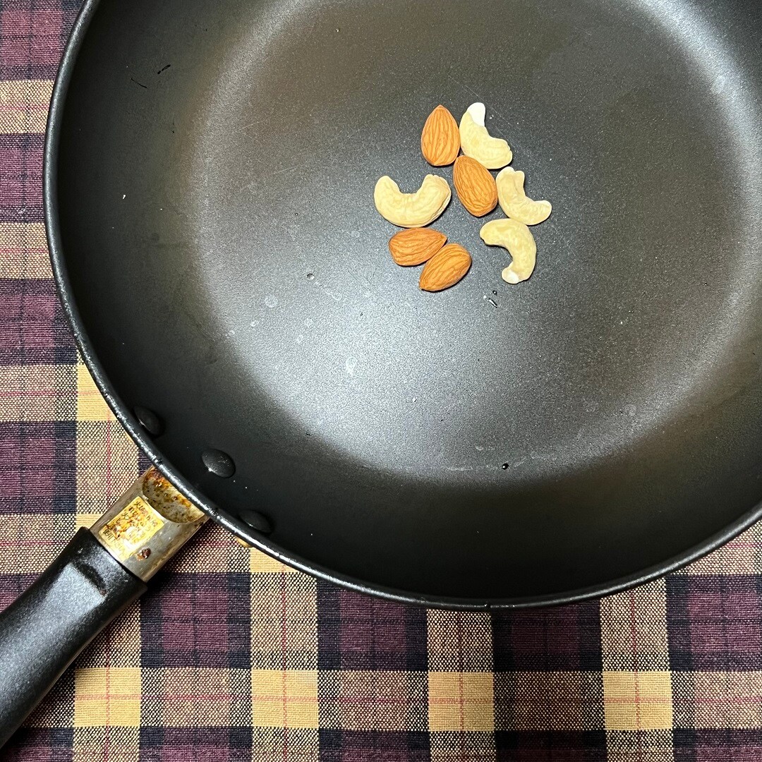まず、フライパンでミックスナッツを炒ります。