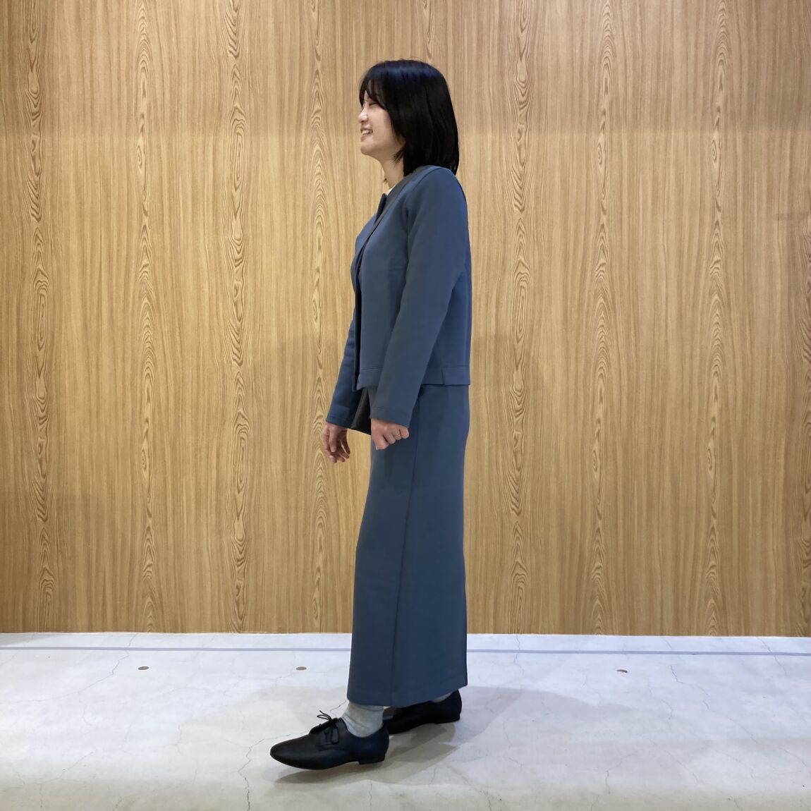 スカートは着まわしやすいストレートシルエットで 後ろにスリットがあることで足さばきも良く着心地抜群です。