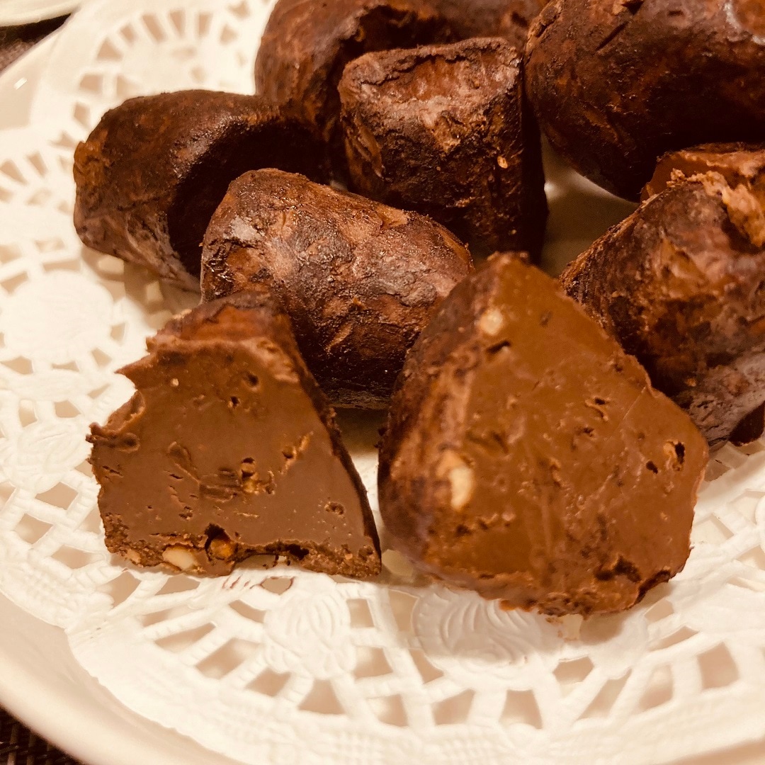 濃厚で香り豊かなカカオトリュフにヘーゼルナッツを練り込みました。ナッツの食感や香ばしさを楽しめます。