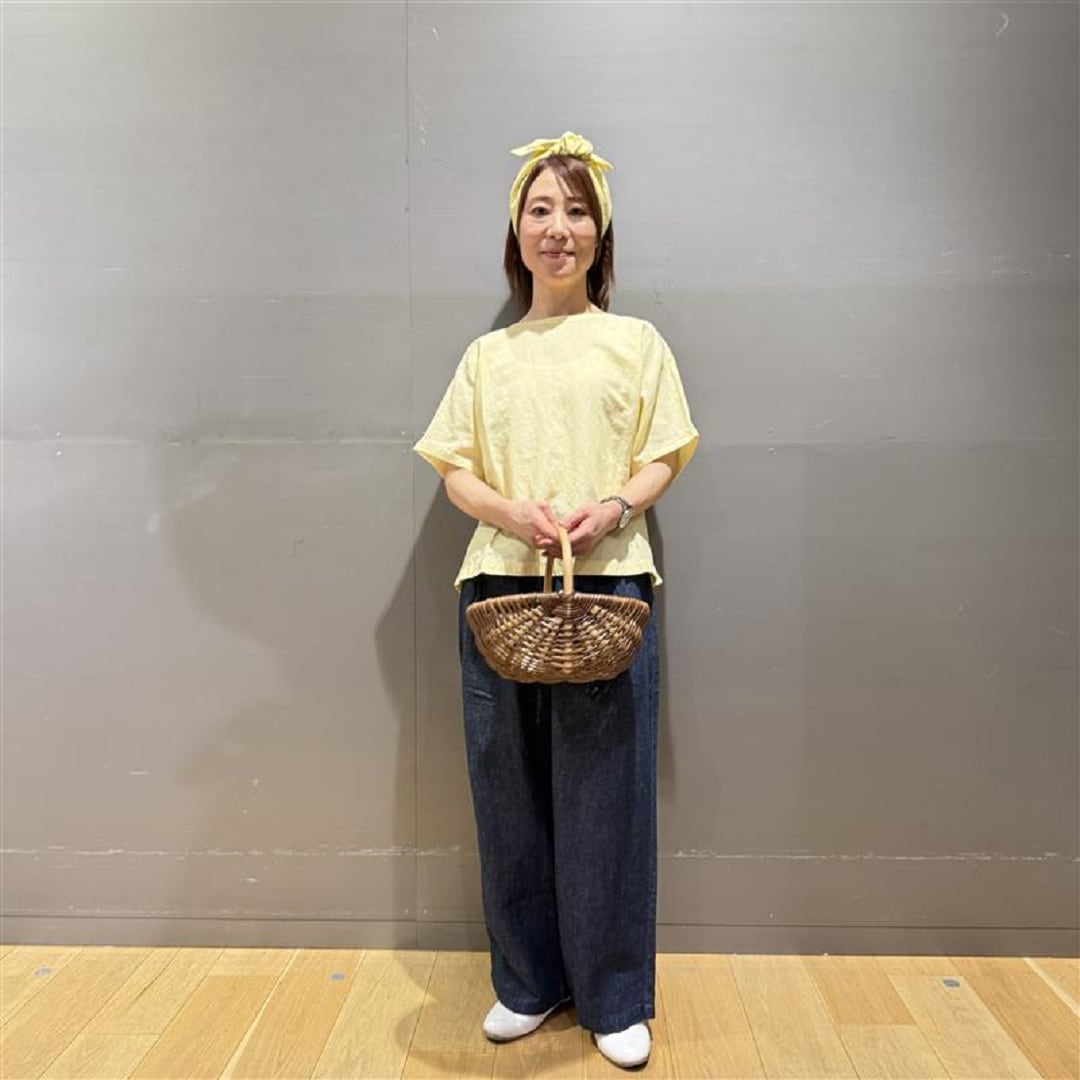 イエローストライプのヘンプコットン半袖ブラウスでスタイリングしたイエローコーディネート