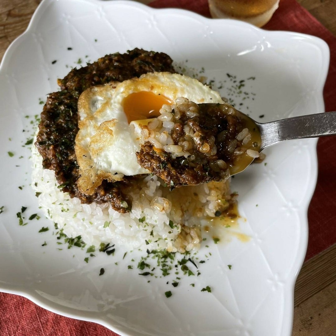 アレンジバージョンとして、両面焼いた半熟目玉焼きを乗せてみました。