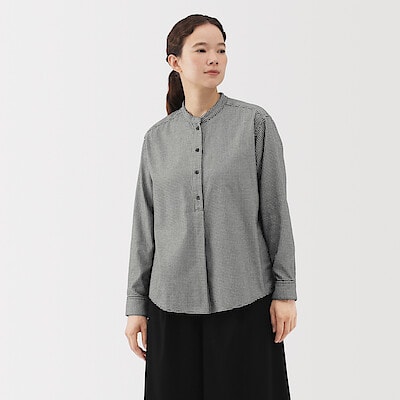 婦人 両面起毛フランネルスタンドカラー長袖ブラウス 婦人M・黒チェック