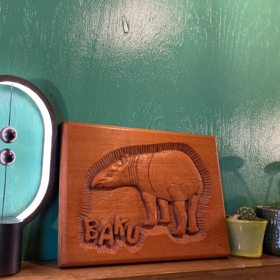 店主の大本さんはマレーバクが大好きだそうで、この木彫りのバクは、なんと大本さんが高校生のときに自ら木彫りし作ったそう。