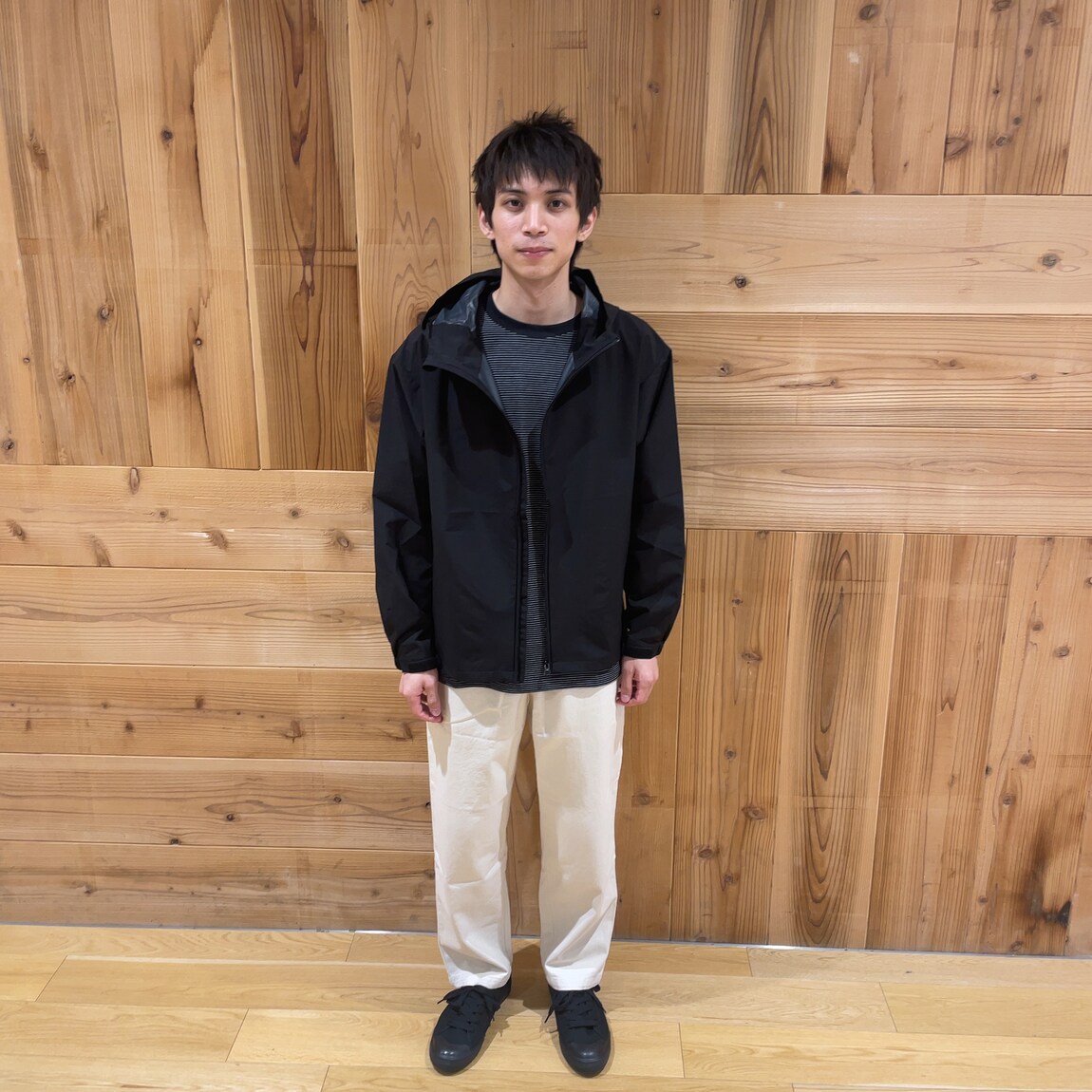 新商品のフードジャケットと天竺編みの長袖Tシャツでコーディネートを組みました。