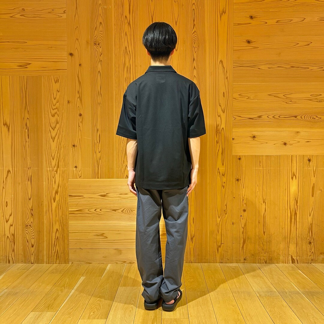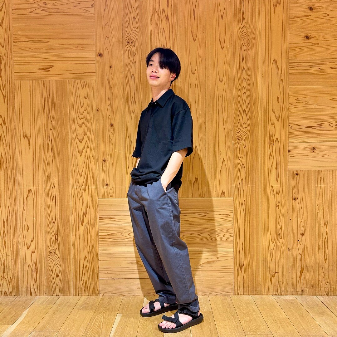 暑い日におすすめの涼感UVカットワイド五分袖ポロシャツを使った黒とグレーコーディネートのご紹介です。