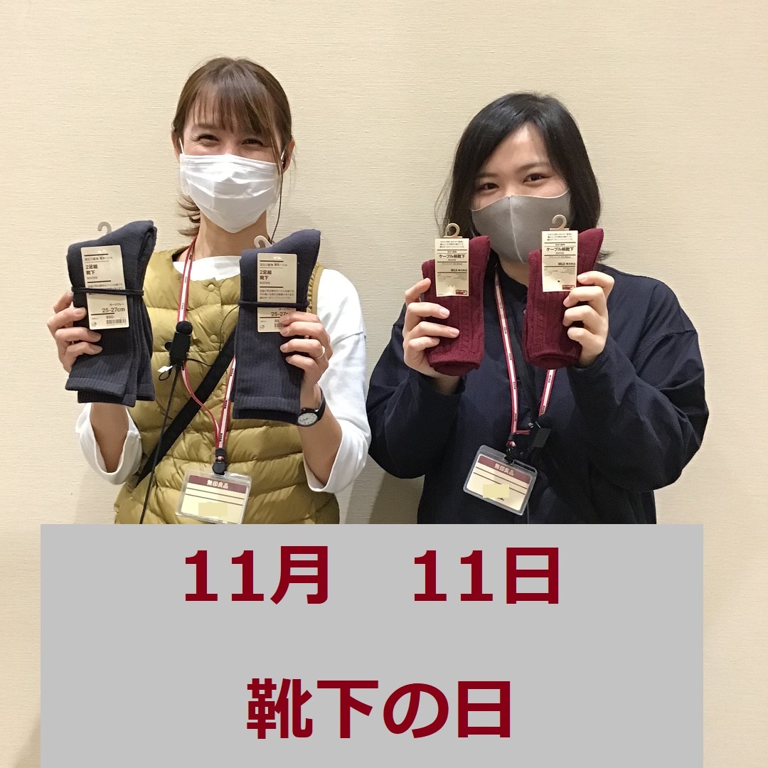 11月11日は「靴下の日」です。靴下を並べた感じからこの日が制定されたそうで、トップ写真でもスタッフが「11月11日」に見えるように持ってみたのがおわかりでしょうか?
