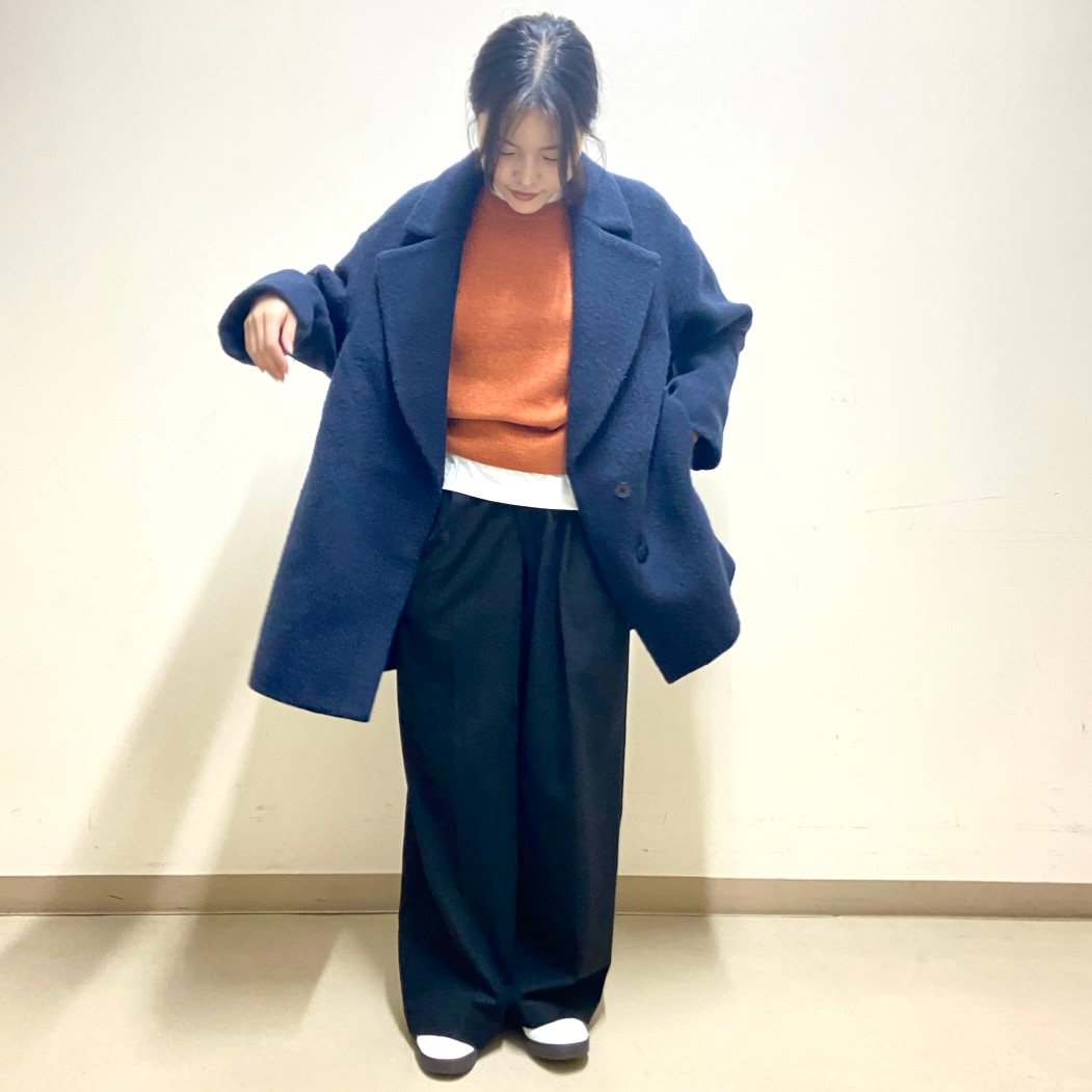 オレンジと相性の良いネイビーのボアコートと合わせています。