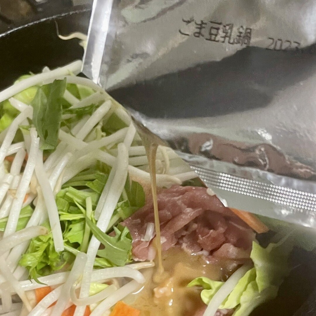 1.フライパンに肉・野菜・鍋の素を入れ中火で炒めます。