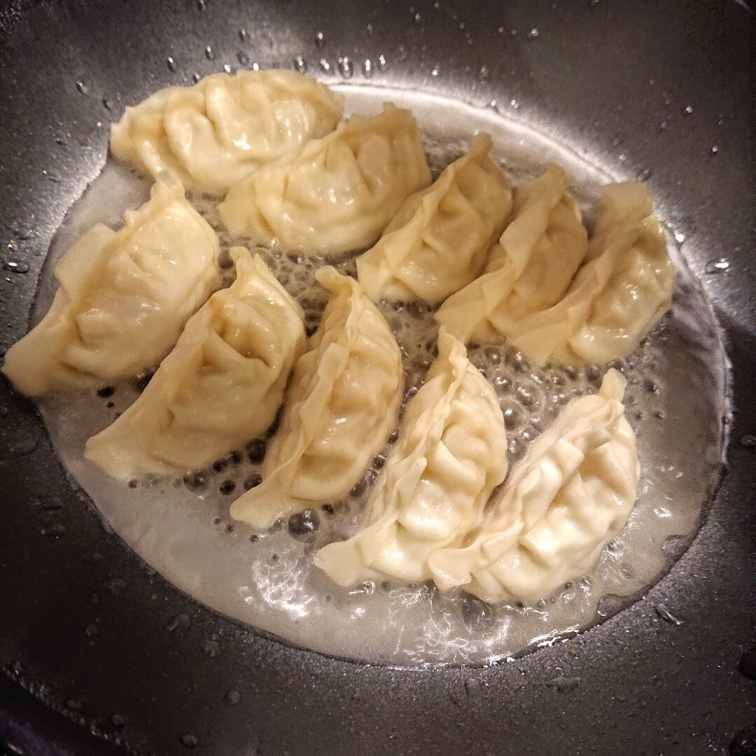 ②水を餃子の上からかけ、フタをして中火で蒸し焼きにします。