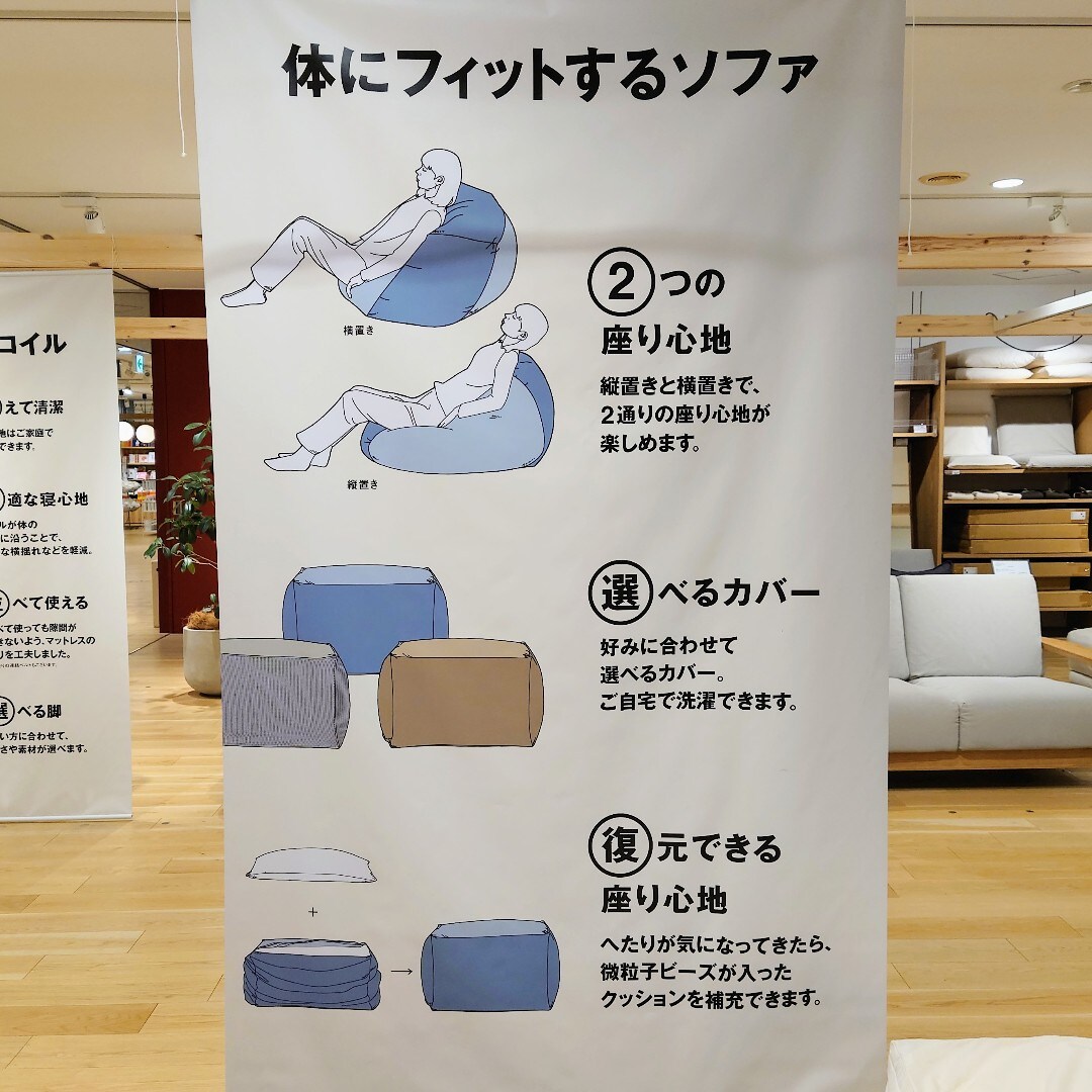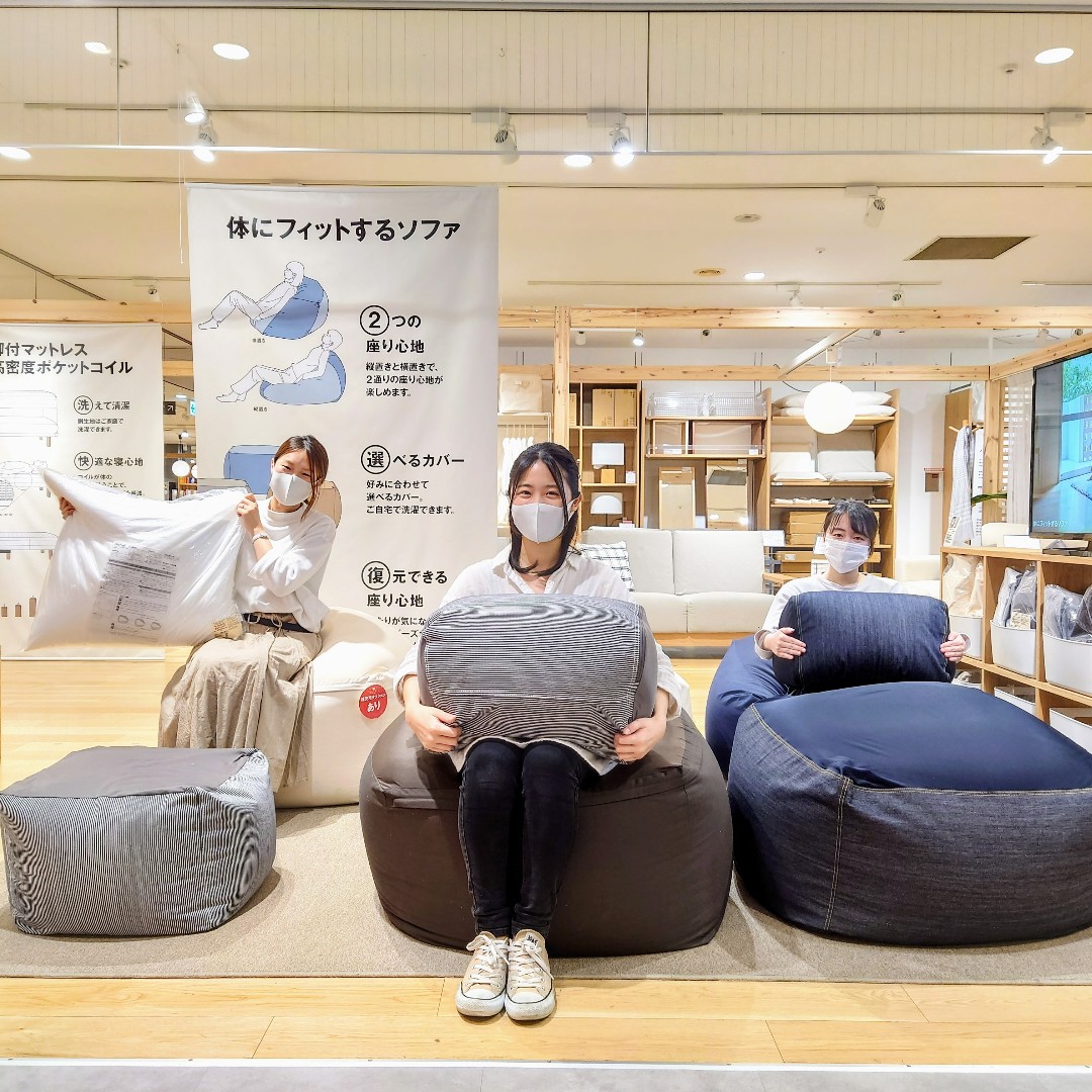 本体は、流動性のある微粒子ビーズが中に入っているので、体型に合わせて変形して包み込まれるような座り心地のソファです。