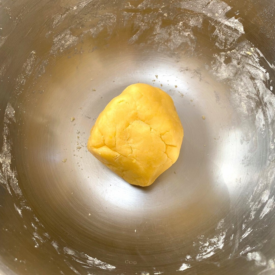 ②全体がそぼろ状になってきたら、手で生地をしっかりこねてまとめます。