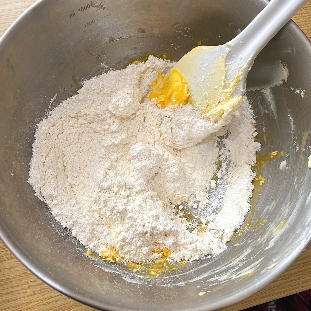 ①ボウル(大)にバターを入れ、クリーム状になるまでゴムベラで練り、卵黄、クッキーミックスを加えて切るよう混ぜます。